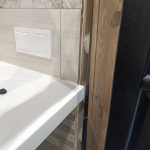 Нужно обрезать 1 деревянный наличник под форму столешницы и прикрепить его обратно к двери, сейчас он снят