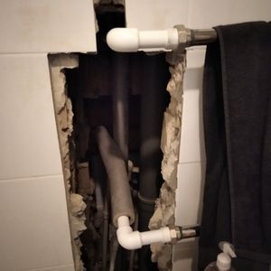 Разбирали плитку для вывода труб горячей воды. Необходимо закрыть дыру, а также, по-возможности, сделать люк